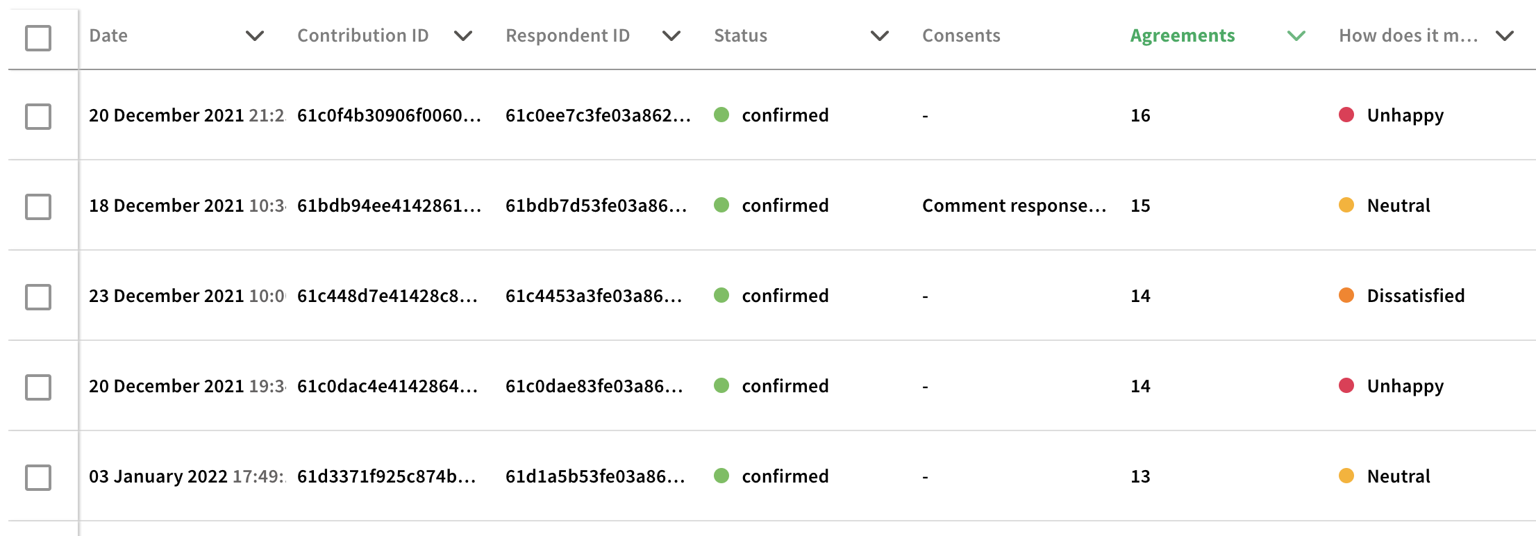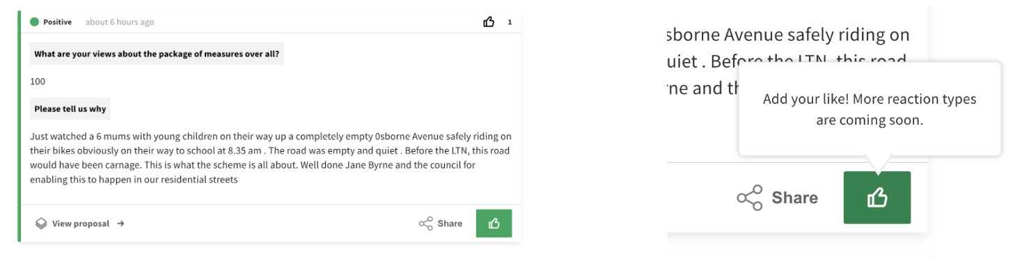 Reactions (formerly known as agreements) allow respondents to react to comments made by other people. Currently, we have only one reaction type which is a 'like' or 'agree', displayed on the contributions list page or on the community heatmap as a 👍.