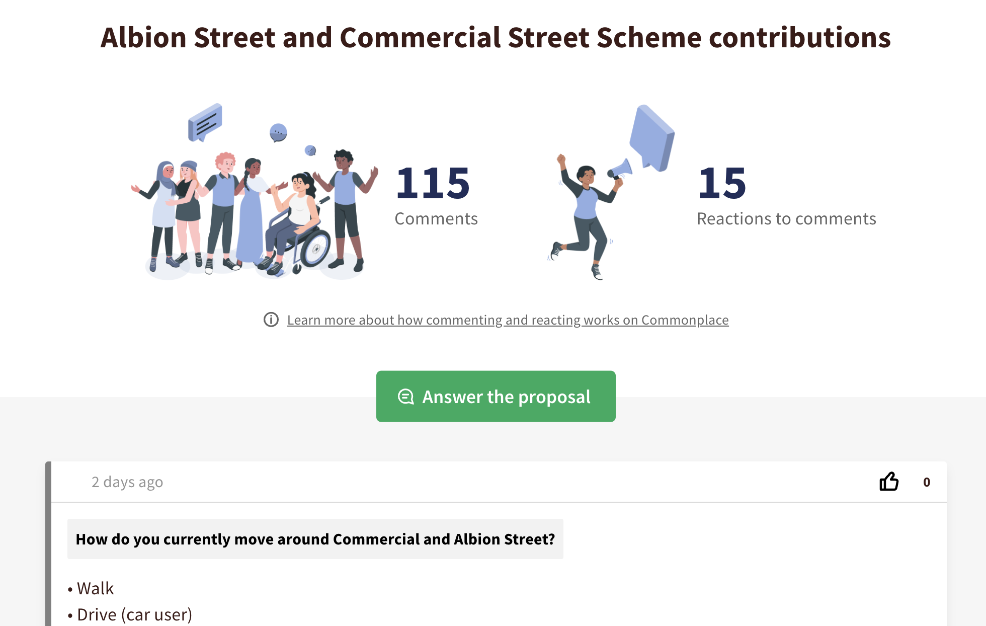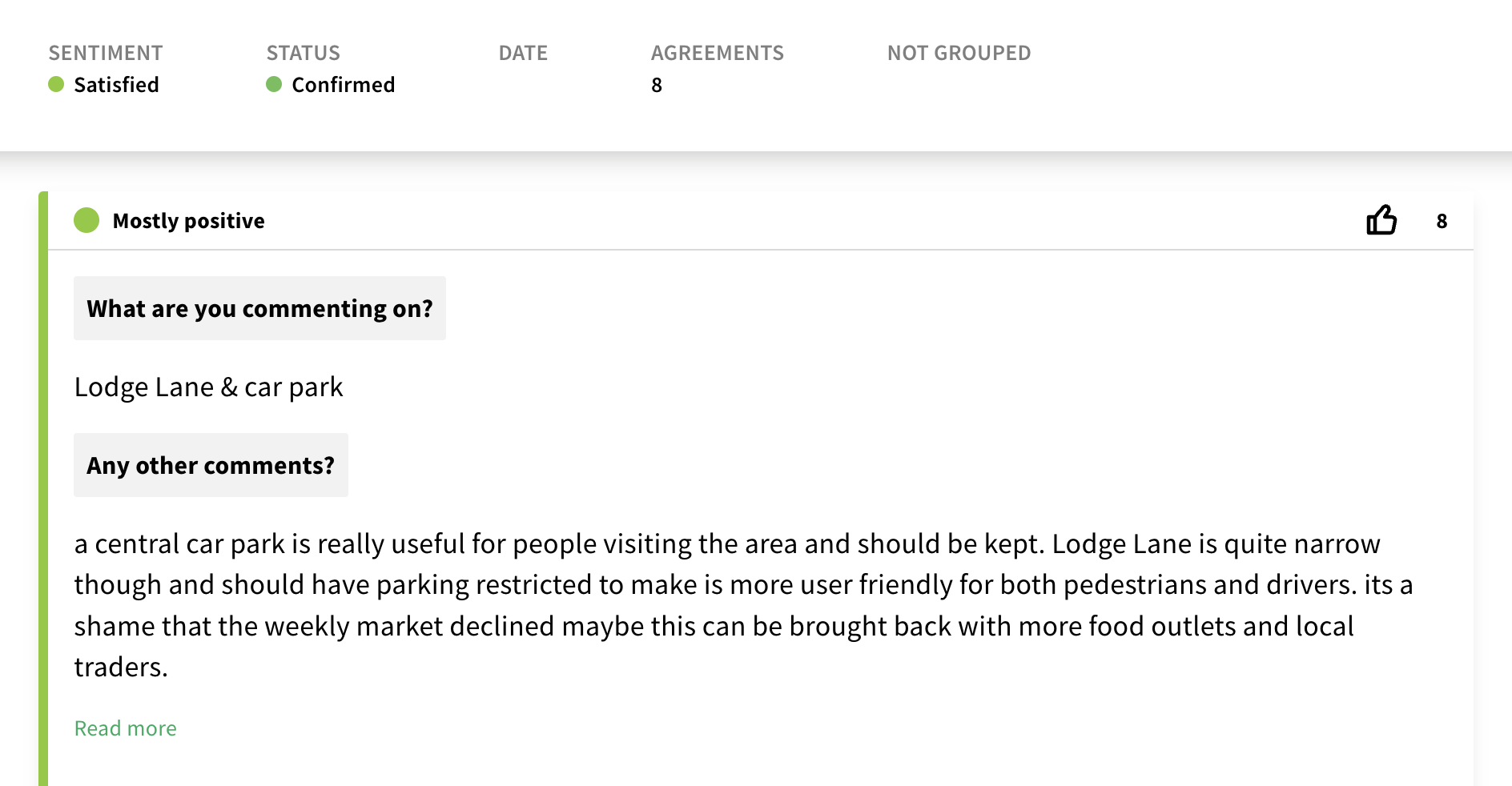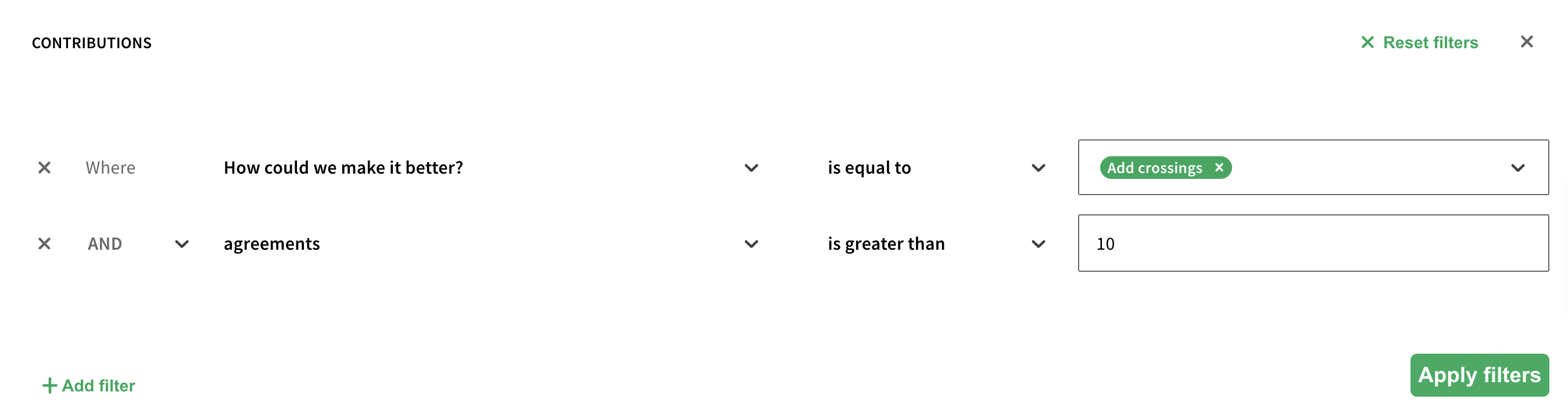 You can sort and filter using this column as you would any other column in the dashboard. For example, if you wish to filter by for all the comments that answered 'Add crossings' and had more than 10 reactions, this would be a good way to understand the level of support for certain initiatives.
