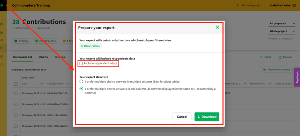 By default, you will be able to download and access all the data in the contributions table on the dashboard. However, this export will adhere to the filters you apply. In addition, you can choose to include or exclude respondents’ data from your export.