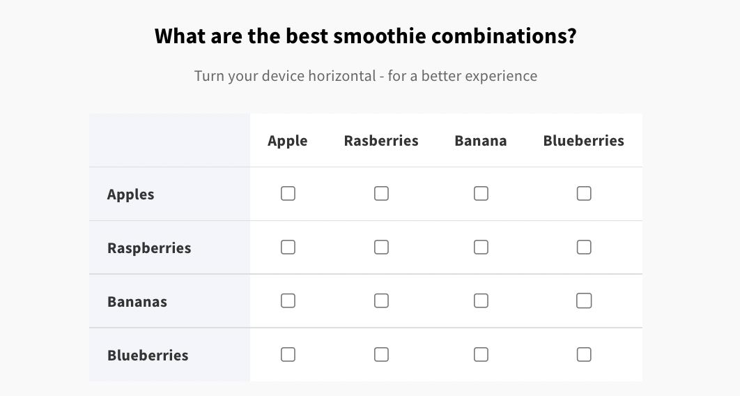 Using Matrix/Grid questions is easy for respondents to understand and answer: With the grid style of matrix questions, and only one set of answering criteria to worry about, matrix questions are much simpler and quicker for participants to understand and answer.