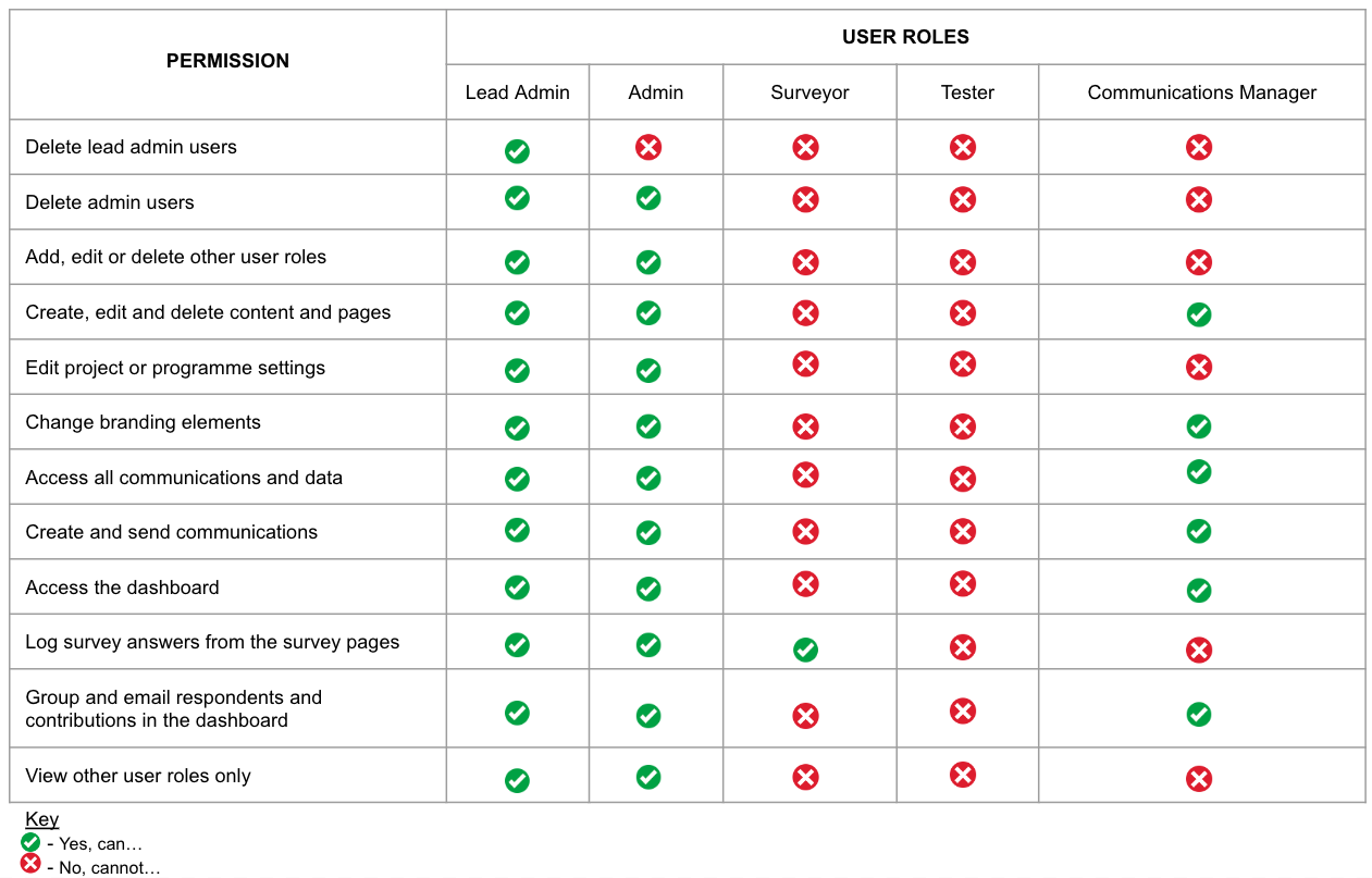 - Surveyor - This role is responsible for logging survey answers but does not have permission to edit, create, delete content, send communications, or manage other user roles.